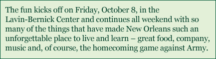 Pictures and video footage from last year’s celebration are available at our reunion website: reunions.tulane.edu. Check it out and visit often for details on events planned especially for the Class of 2010.